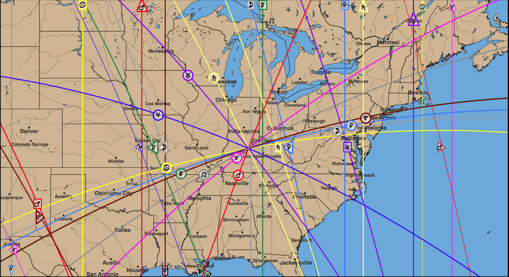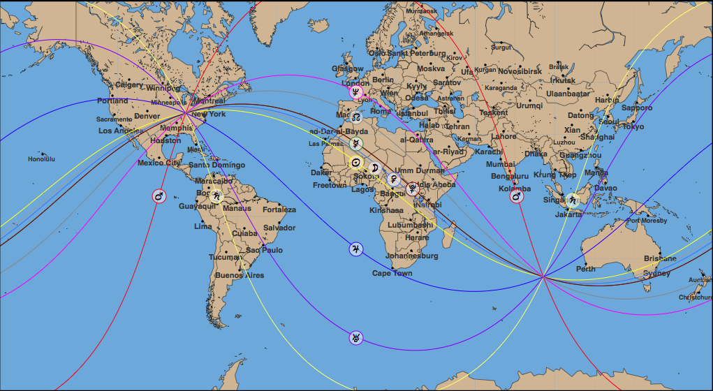 Local Space Lines are great circle circles around the globe originating usually at the place of birth or place of domicile. If you were to follow the planet from your origin eventually you would find a place on the surface of the Earth where that planet would be directly overhead. That path is the great circle route and represents potential adventures corresponding to the nature of the planet. these lines converge on the exact oppossite point on the globe.